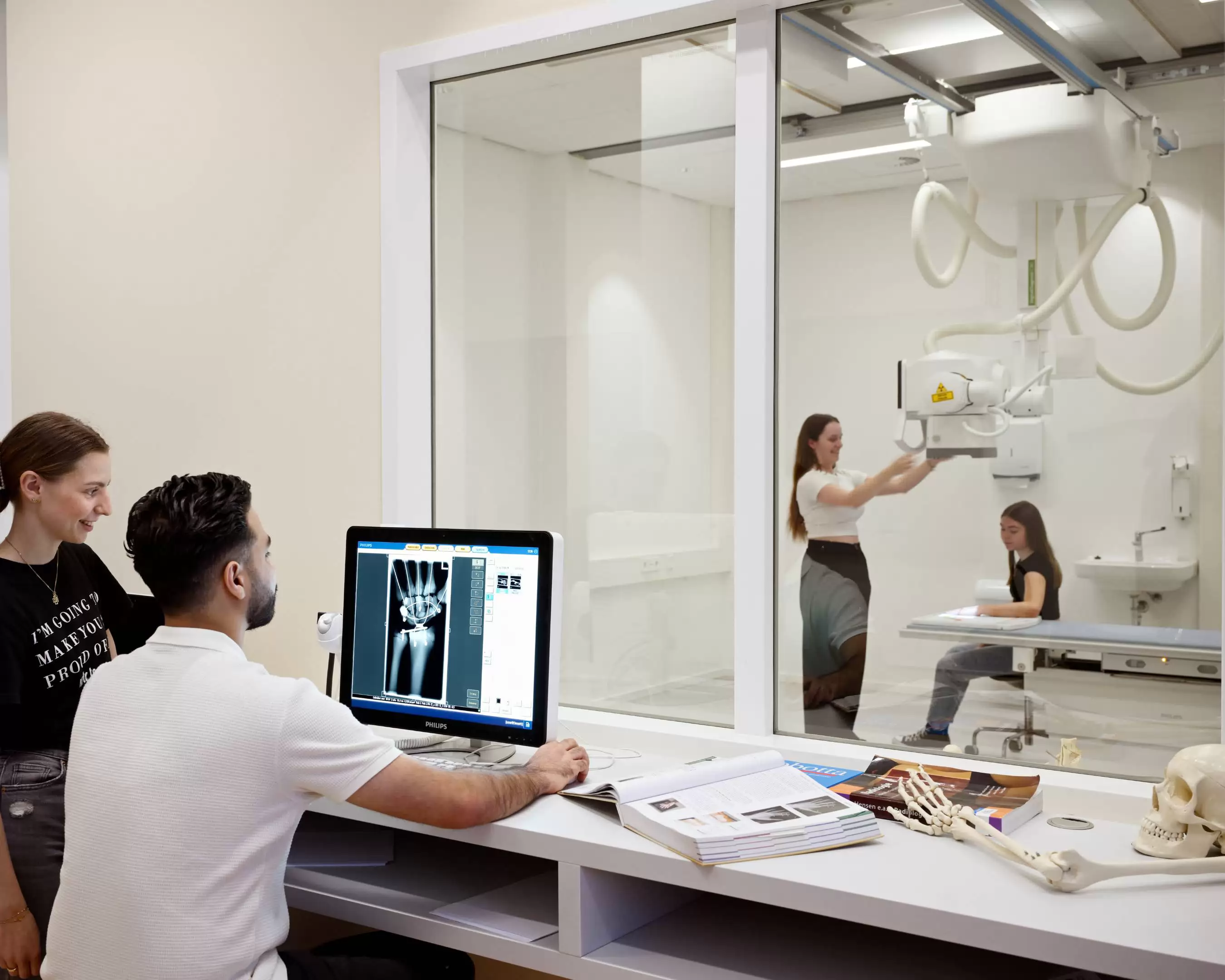“Wat dit werk zo leuk maakt is de afwisseling. De ene dag sta ik op de buckykamer en maak ik röntgenfoto’s van botten, buik of borstkas; het ‘gewone werk’, zeg maar. Op een ander moment ben ik op de ok en assisteer ik tijdens de operatie de chirurg die bijvoorbeeld wil zien of de pin bij een heupprothese goed geplaatst is of dat het schroefje diep genoeg zit. Op de doorlichtkamer doe ik onderzoek naar de organen, meestal bij mensen met slikklachten. Verder assisteer ik de radioloog bij het maken van echo’s bij klinische patiënten. En als ik me straks ga specialiseren, wordt mijn takenpakket nog weer breder.”